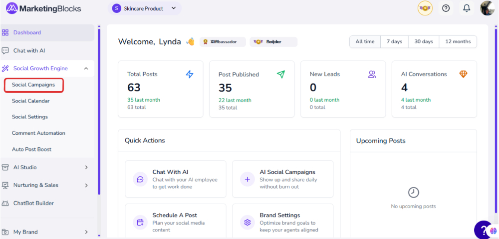 The AI Social Spark Tool in MarketingBlocks is an AI-powered tool that enables you to create campaign posts for your business. This tool assists you in organizing and scheduling content across your various social media accounts with the help of AI.