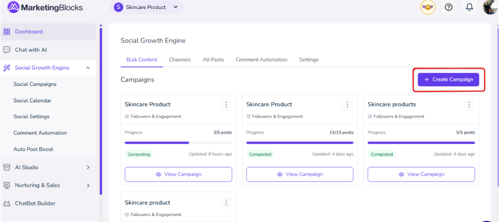 Step 3: When it opens, under the Bulk Content, click on Create Campaign